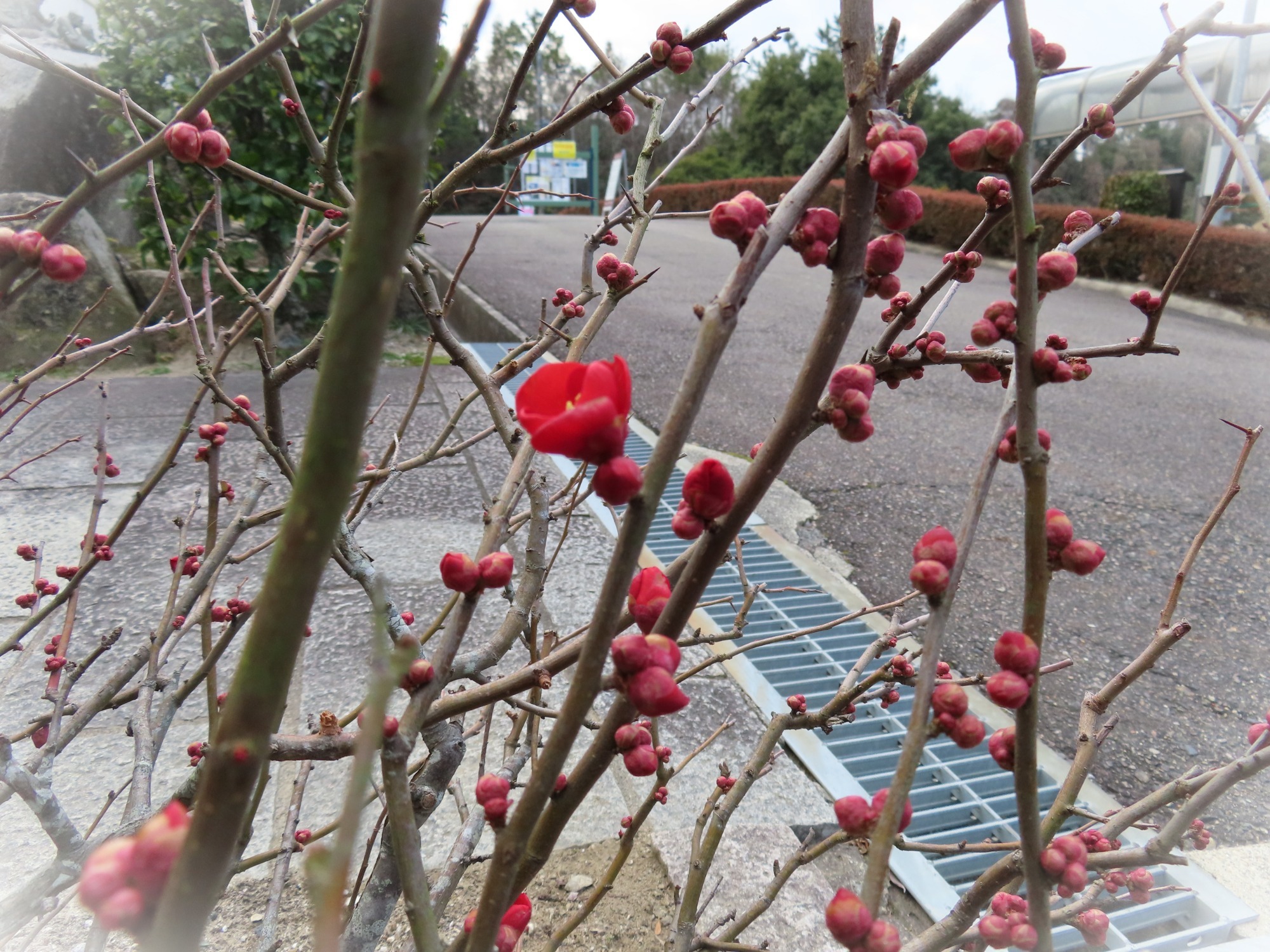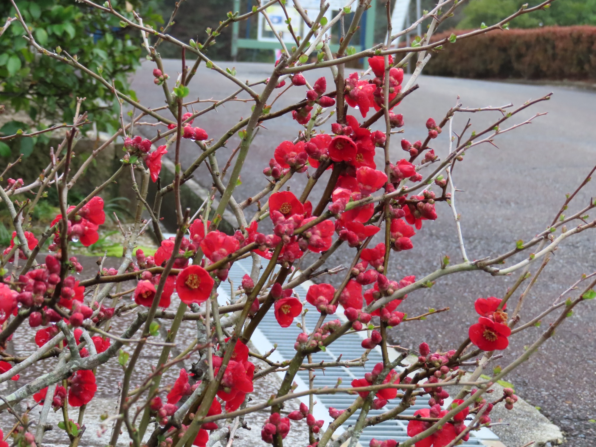 園内入ってすぐのところにボケの花が一輪咲きました❁